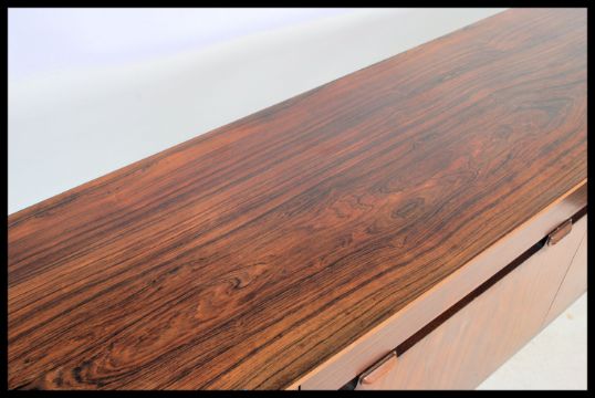 Nathan Furniture - Caspian range - A retro vintage 1960's teak wood sideboard comprising of three drawers above a drop down cocktail cabinet flanked by shelved cupboards to eitherside, the doors having a patruding pull handle to the top. the sideboard raised on rounded sqaure legs and single stretchers. Applied label to inside of the door. Matching table and chairs in lot 1004. Measures 84cm x 185cm x 46cm.