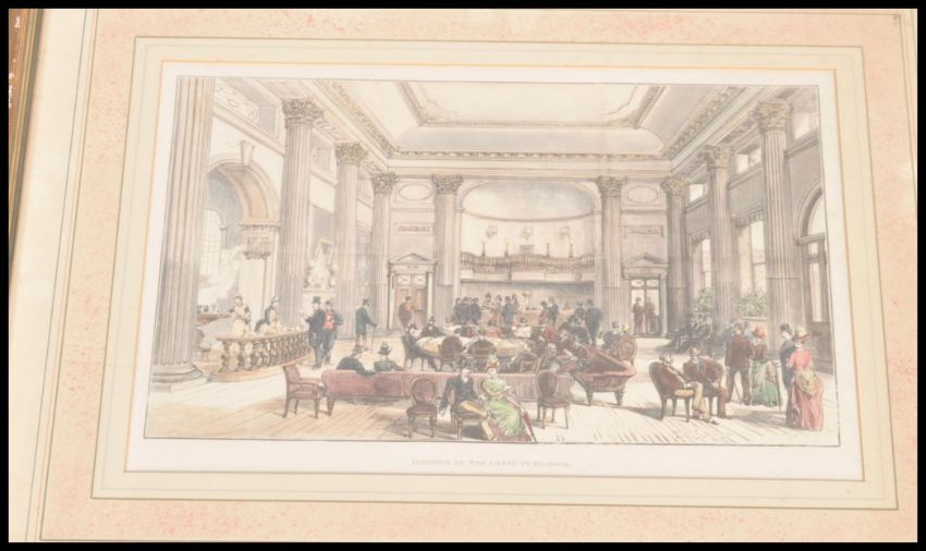 A collection of framed and glazed 19th century style architectural etchings / plates pictures of famous landmarks. To include The Prospect of Montague House to the street London,  Interior of the Grand Pump Room, Drury Lane etc.