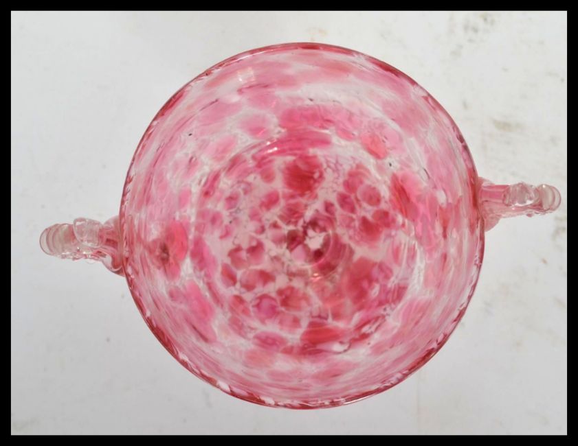 A stunning early 20th century Murano studio art twin handled mottled pink  glass chalice raised on a baluster stem terminating in a plain conical foot. Measures 11 cm high.