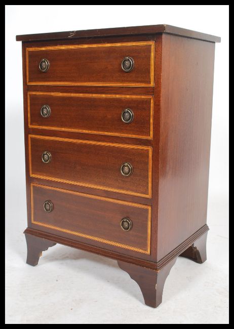 A Georgian style regency revival bachelors mahogany chest of drawers of smaller proportions having satinwood inlay. The straight bank of four drawers having brass hoop and flower head handles raised on four splayed feet. Measures 71cm x 51cm x 40cm.