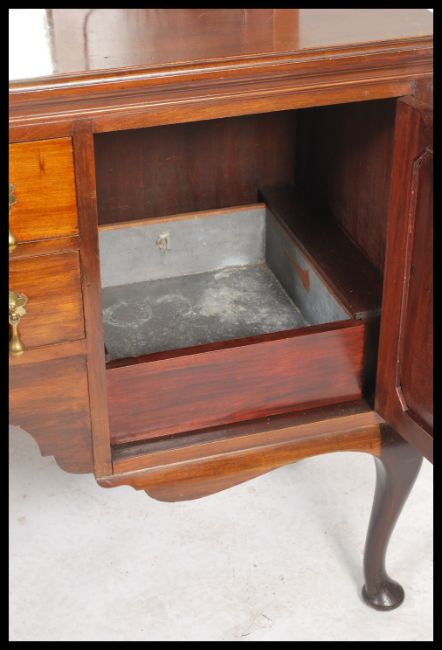 A 1930's mahogany mirror back sideboard having an arrangement of drawers and cupboards being raised on cabriole legs with ball and claw feet. Measures 177cm x 153cm x 53cm.