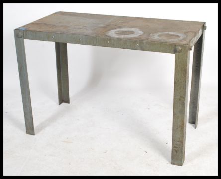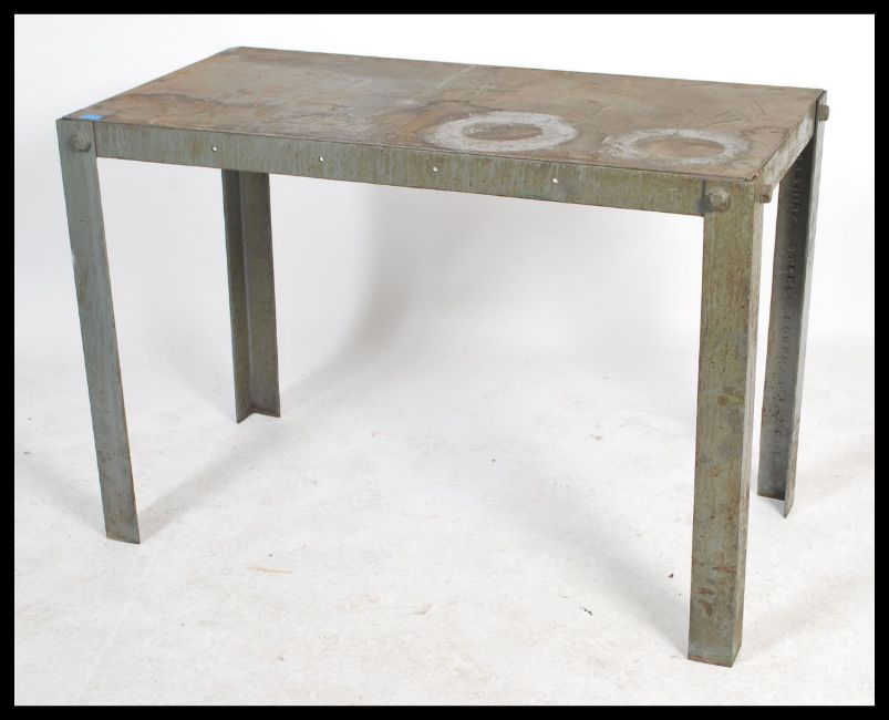 A stunning vintage 20th century industrial large metal factory worktop / bench / side table raised on a steel frame secured with heavy duty bolts. Applied makers plaque for Brixey Limited. Measures 85cm x 127cm x 66cm.