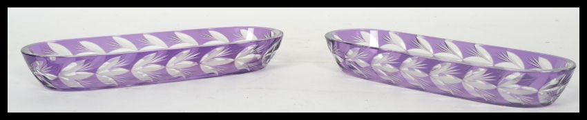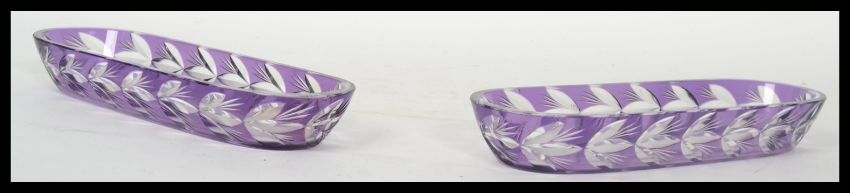 A pair of 19th century Victorian cut glass pen tray's each of lozenge form having purple Bohemian style bodies with faceted decoration. Measures 24 cm long.