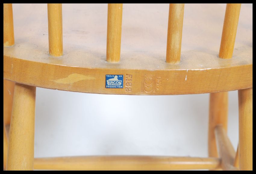 A set of 3 original mid century Ercol - CC41 utility beech wood carver dining chairs having blue labels. Raised on turned legs with saddle seats and hoop backs, scrolled elbow supports