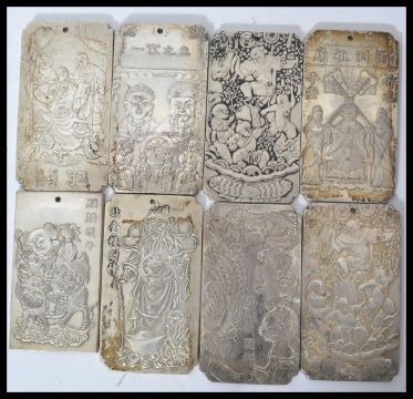A collection of eight Chinese white metal amulet / scroll weights, cast in relief with various images each piece with makers mark to verso. Measure 10cms tall.