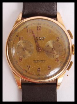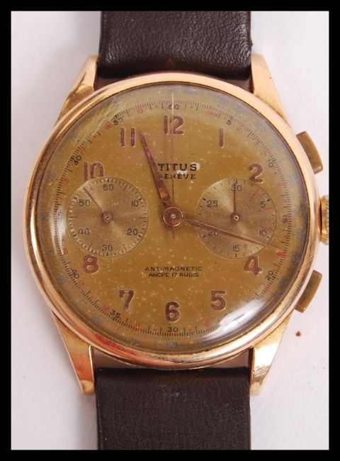 Titus Geneve - Gentleman's 18k gold case chronograph wristwatch, the signed silvered dial inscribed 'Antimagnetic' with Base 1000 tachymetre scale, subsidiary seconds dial, 30 minute register and centre seconds hand, 17 jewel movement, dust cap and snap-on back numbered 132. Set to a vintage brown leather strap.