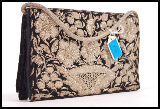 A vintage mid 20th century rare Aircraft cigarette lighter clock combo together with a ladies evening clutch bag. The bag decorated with an elaborate silver thread design applied label Made In India to the lining with additional a silver plated cigarette case