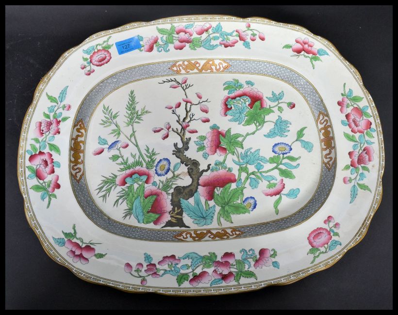 An very large antique 19th century Victorian Indian Tree pattern meat platter / plate having enamel painted and transfer printed decoration. Minton marks to back with painted marks.