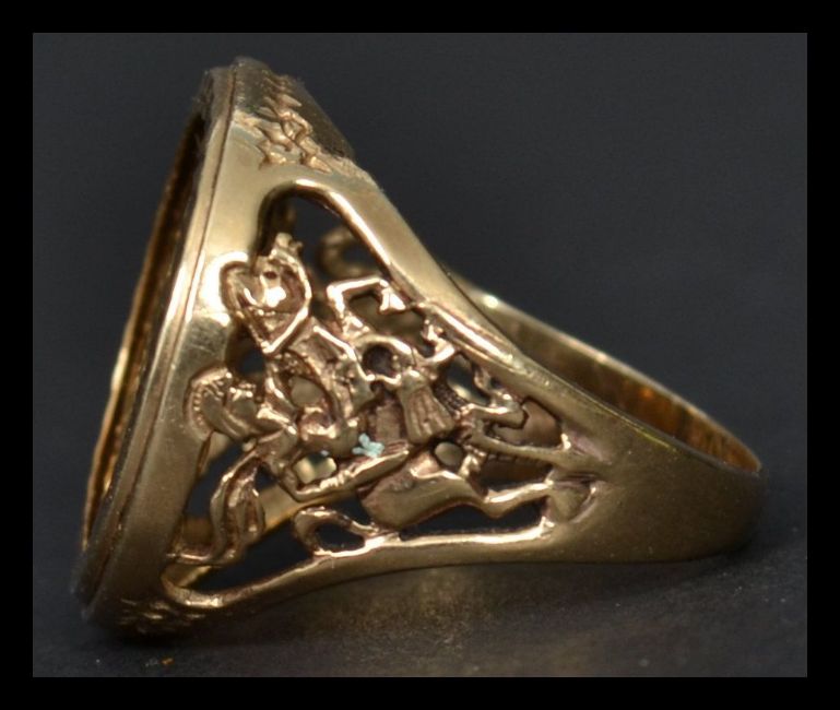 A vintage 20th century half sovereign ring having a 1982 Elizabeth 2nd half sovereign coin set within a 9ct gold ring mount. Total weight 9.5 grams.