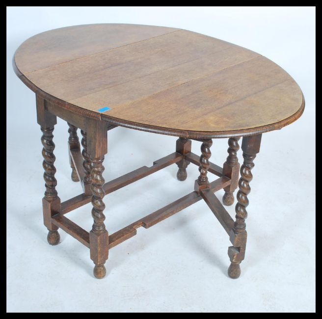 A 1920's solid country oak barleytwist gateleg / drop leaf dining table. Raised on barley twist legs with gate leg action supporting the half moon shaped leaves. Measures: 70cm high x 90cm wide x 46cm deep.