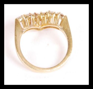 A hallmarked 18ct gold and diamond wishbone ring. The seven round cut diamonds of approx 10pnts each set in prong mounts in a V formation. Bearing London hallmarks. Size K weighs 4.3 grams.