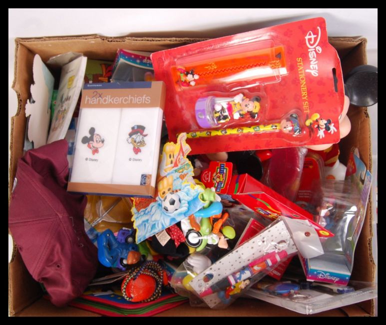 A large collection of various branded Disney Mickey Mouse toys & accessories to include; fast food meal toys, mugs, stuffed Mickey's, stationary, pirate ship, rubber bath toys, money bank, key rings, jigsaw puzzle & many more. Mostly loose, some items boxed.