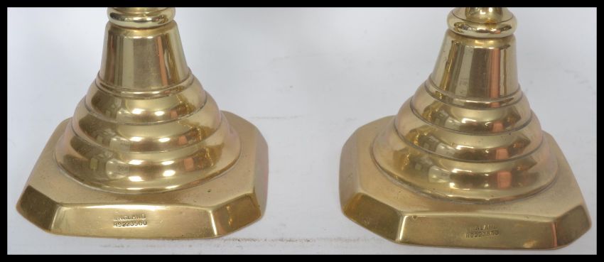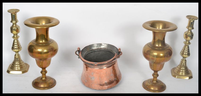 A pair of large Victorian brass candlesticks together with a large heavyIndian brass vase and a 19th century copper jam pan with handle. Higheest measures 30 cm.