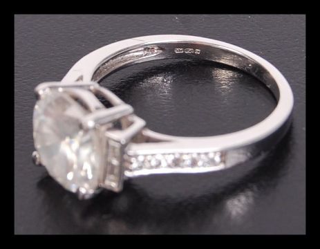 An 18ct white gold diamond ring, the central brilliant cut stone approx 3.6ct being claw mounted flanked by two baguette diamonds, the shoulders being channel set with 5 diamonds each side.Total carat weight 3.78. Size N. Total weight  4.2g