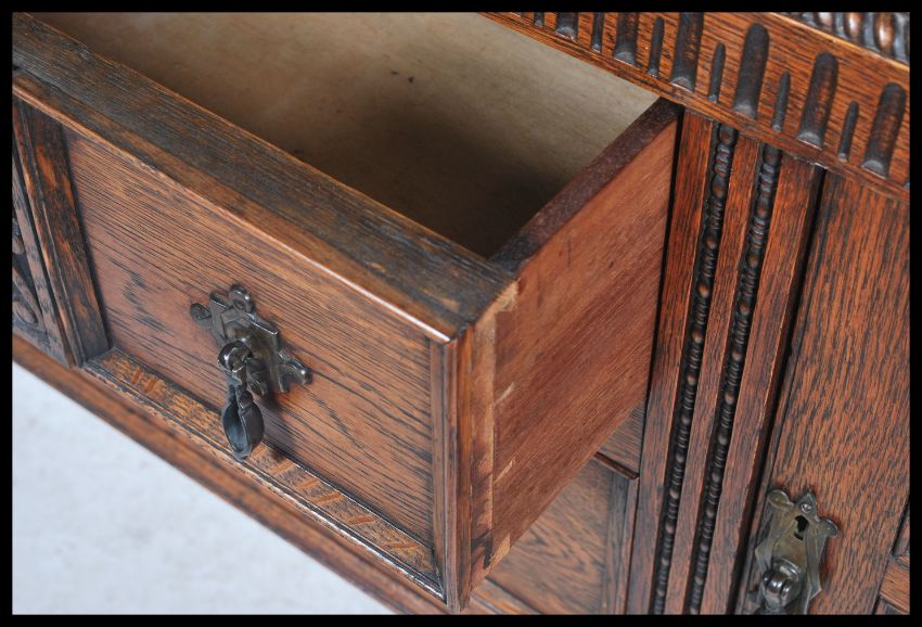 A 1920's oak barley twist dresser sideboard. The upright back with leaded glazed door cabinet over a series of drawers and cupboards. All raised on barleytwist supports