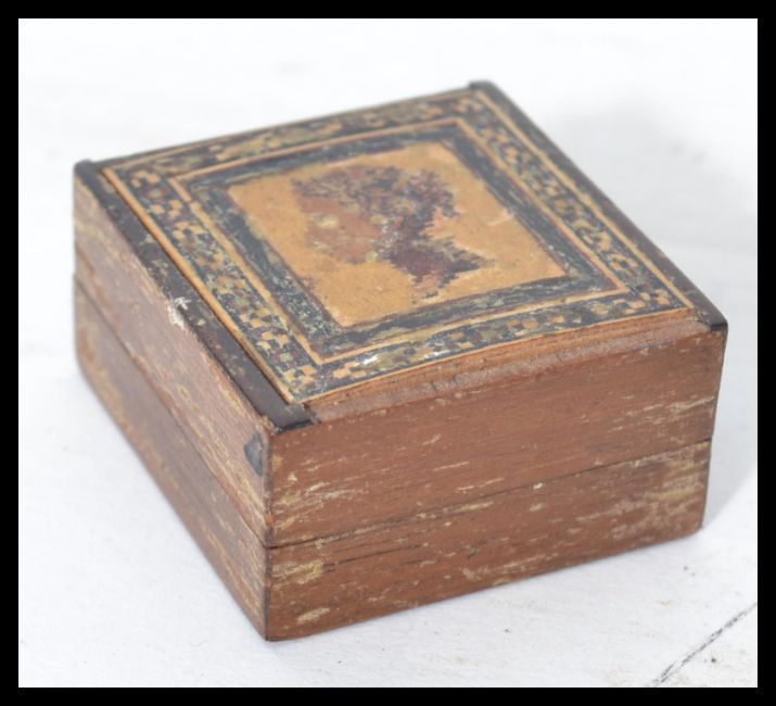 A 19th century Victorian mahogany stamp box having tunbridge inlay with a micro mosaic pictorial of young bust Queen Victoria. Measures 2.5 cm high, 4 cm wide and 4.5 cm deep.