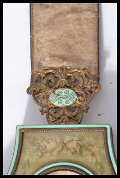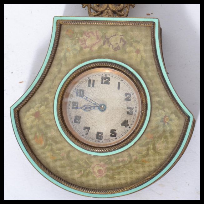 A 19th century Austrian tapestry and brass hanging carriage / sedan chair clock of axe head form. The silvered dial having faceted hands with gilded border and glass framed tapestry surrounds and pieced ormolu decoration. Stamped made in Austria to verso. Measures 26 cm long.