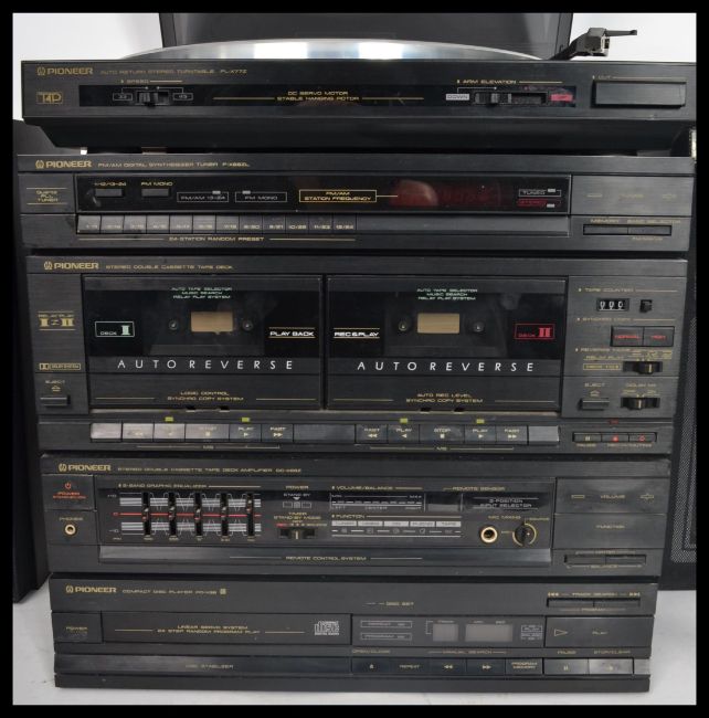 Pioneer - A 1980's sound system comprising of a twin cassette, disc player and turntable together with a pair of S-222x speakers. Stack measures 41.5 cm high.
