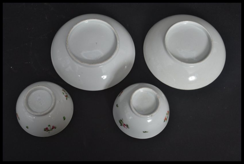 A pair of 18th century English tea bowls and saucers painted with pink ribbon and floral sprays.