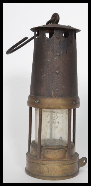 An early 20th century cast metal and brass miners lamp having a hook atop. Measures 26 cm high
