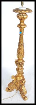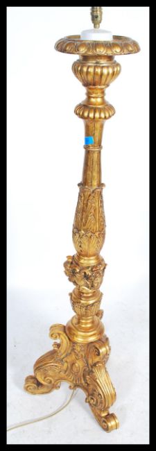 A large ornate gilt standard lamp raised on moulded tripod legs with gadrooning and acanthus leaf decoration with putti masks.