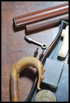 A collection of curios to include an Ivory walking stick handle, another walking stick handle, boot brush with advertising for Goodrich Solid Motor Tyre, harmonica, pin cushion, lighter, cased pair of Dolland opera glasses etc please refer to images.