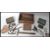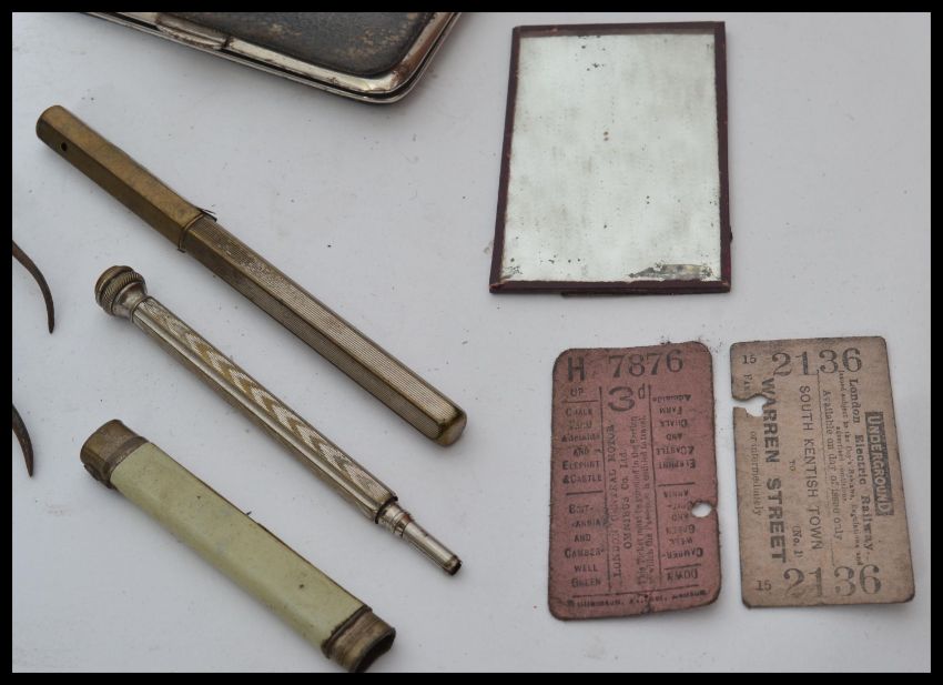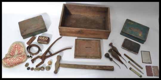 A collection of vintage items dating from the 19th century to include leather working tools various military interest buckles , vintage tin , card case , silver pencils etc. Please see images. Box measures 9.5 cm high.