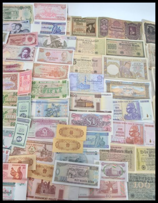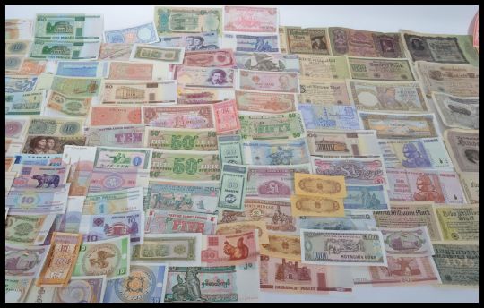 A collection of bank notes from around the world to include China 1 Fen notes x 4, British Armed Forces notes, German Reichsbank notes post WWI, Reserve Bank of Zimbabwe notes, Vietnamese Dong notes, Banco Central de Nicatagua, Bhutan, Indonesia, Belarus, Indonesia, Afganistan, Central Bank Of The Islamic Republic Of Iran etc.