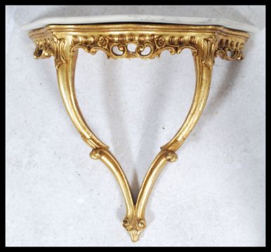 A vintage 20th century small marble topped gilt scroll work wall mounted console table. Measures: 54cm high x 24cm wide x 59cm deep.