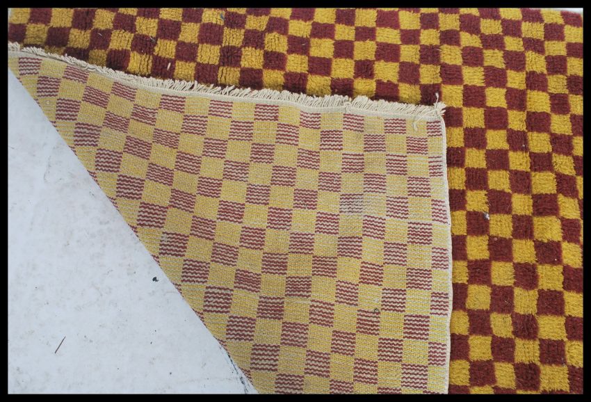 An early 20th century Tibetan polychrome chequer pattern rug . The rug decorated with red and yellow continuous squares. Tassled ends. Measures 153cms x 81cms
