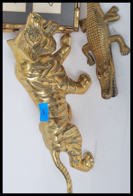 A pair of framed and glazed signed in pencil prints of playful Tigers by Vivienne St Clair together with a brass Tiger and brass crocodile.