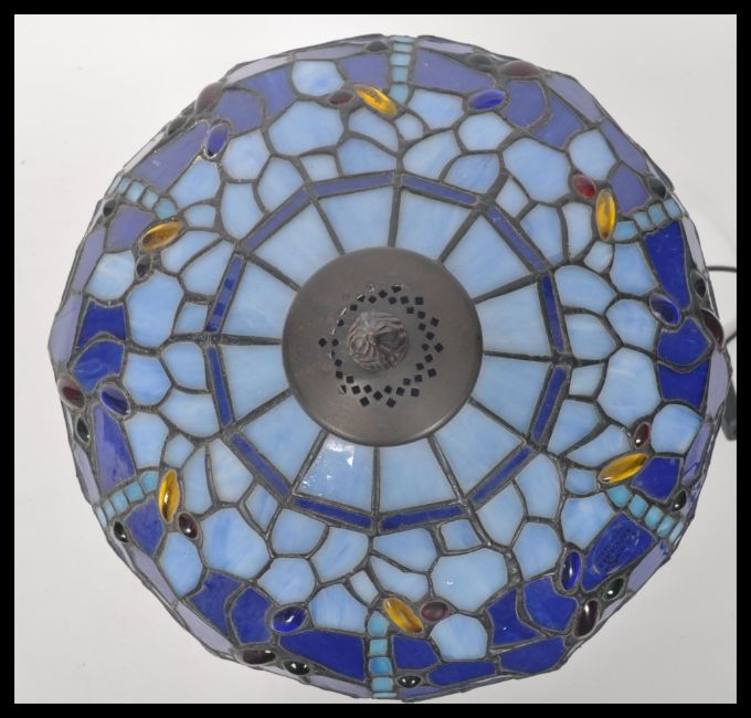 A vintage Tiffany style leaded glass table lamp having a naturalistic style base with stained coloured glass shade. Measures 48 cm high.