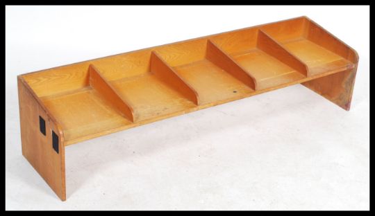 A Mid Century beech post office sorting tray / desk tidy / pigeon hole having multiple tray sections raised on an open plinth base with ministerial markings dated 1959.