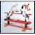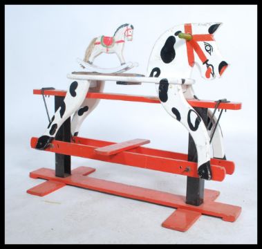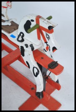 A mid 20th century retro child's rocking horse having handles to side raised on painted red supports along with a smaller miniature model of a rocking horse. Measures 70cm x 97cm x 38cm.