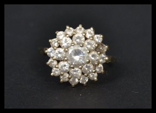 A hallmarked 9ct gold CZ cluster ring having a central white stone with a two layer cluster of smaller stones. Weighs 3 grams size P.