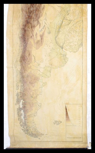 An early 20th century Geographical canvas backed  physical map of Argentina, showing contours and mountain ranges. Measures 215cm x 112cm.