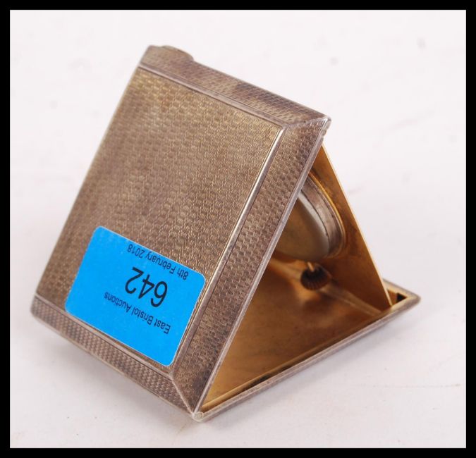 An early 20th century silver hallmarked folding travelling desk clock by Cohen & Charles being hallmarked for Chester 1922. The white enamel dial having faceted hands sety within an engine turned case. Weighs 143.1 grams.