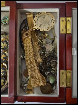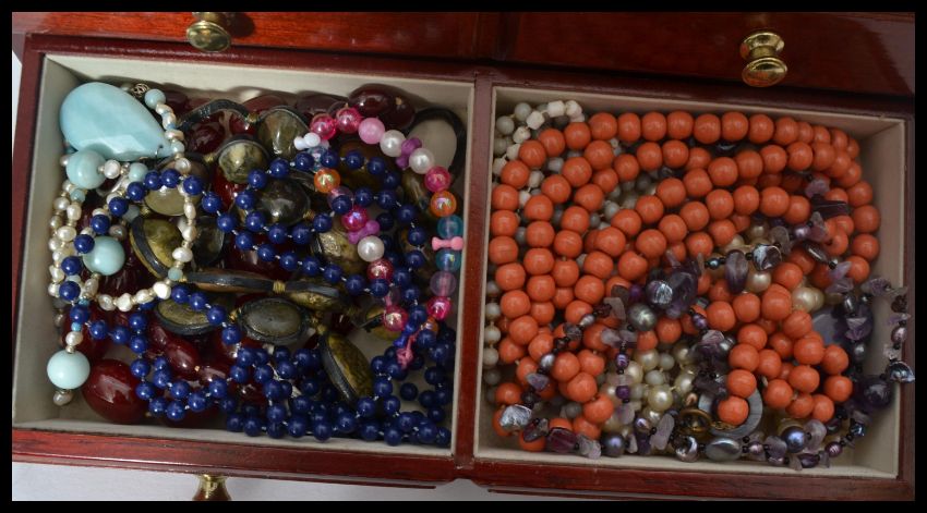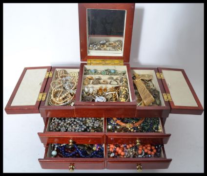 A collection of vintage costume dress jewellery to include rings necklaces bangles etc. contained within a vintage jewellery box.  Please see images. When closed measures 20 cm high.