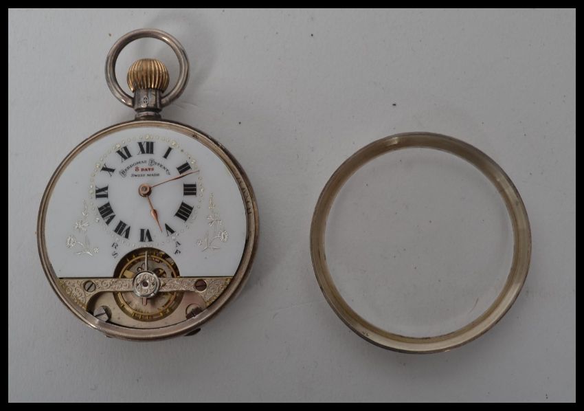 An early 20th century French silver pocket watch bearing London import marks. The white enamel face having a Roman numeral chapter ring with open movement, The dial marked Hebdomas with 8 day Swiss Made. Anchre movement to inside. Weighs 83.4 grams.