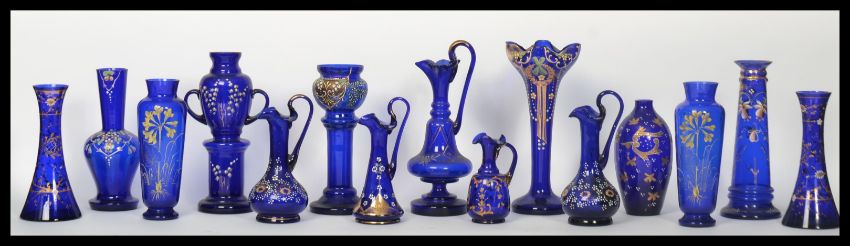 A collection of fourteen Bohemian blue glass dating from the 19th century to include ewer jugs , pairs of vases, urns etc. Each piece gilt decorated and hand painted with flowers. Please see images. MHighest measures 26.5 cm.