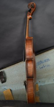 An early 20th century violin musical instrument complete with mother of pearl bow in fitted case.