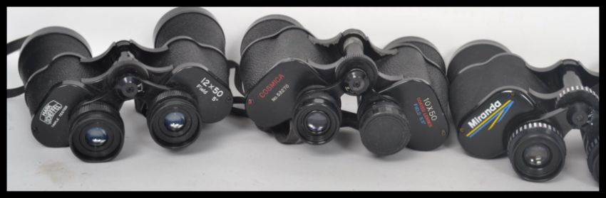 A collection of 7x various branded binoculars comprising of; Mark Scheffel 20x50 & 12x50, field binoculars, Miranda 10x50 gold coated optics binoculars & others. Mainly within their original carry cases.