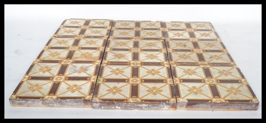 A set of nine 19th century Victorian encaustic ceramic tiles by Campbell. Measures 15.5 cm wide and 15.5 cm deep.