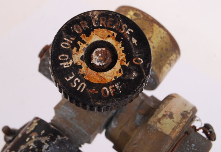 An original WWII Second World War likely Bomber crew / high altitude pilot's Oxygen tank. Gauge to top showing 'minutes remaining'. Measures 32cm tall.