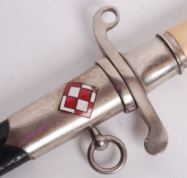 An original Polish Air Force Dress Dagger (Warsaw Pact / Cold War Era) - the double edged steel blade numbered 28284, the nickel plated hilt with recurving crossguard, ivorine grip and cannister shaped pommel set with the Polish eagle, the black leather scabbard with nickel plated mounts and enamel badge. Measures approx; 38cm total.
