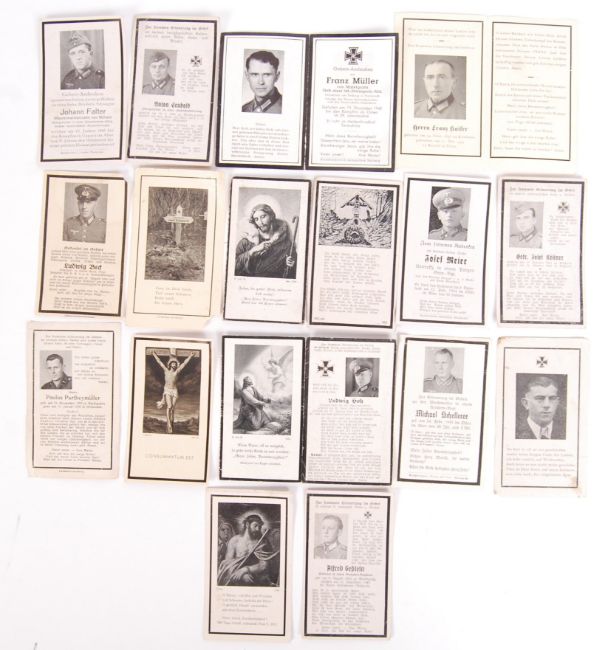 A large collection of assorted WWII Second World War German / Third Reich ' In Memoriam ' soldiers memorial postcards / paper slips. Each with a photograph of the soldier, with German memorial text beneath. Average size; 12cm x 7cm. x18 in total.