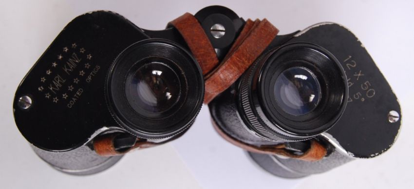 A pair of original WWII Second World War German Karl Kainz made 12x50 no.5 field binoculars. No. 113627. Measure approx 14cm tall. In fully working order, with leather neck strap. Within its original leather case.