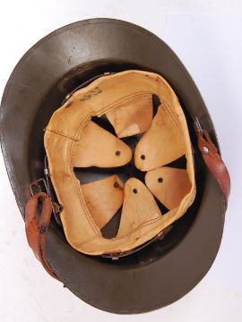 A good original WWII Second World War French Adrian steel helmet. Complete, and generally in superb used condition. Retains its original inner leather strapping and inner liner. ' RF ' with Anchor badge to front, the liner noting the size as 59. A very good surviving example of this particular helmet.