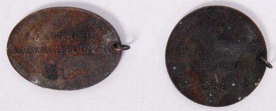 Four assorted WWII style Nazi German Third Reich ID dog tags & medals to include; Staatliche Kriminal Polizei 418 disc, Geheime Feldpolizei 544 disc, SS Swastika medal & other.  NOTE: From a private collection of German militaria comprising of both genuine and replica items. Where possible we have stated ‘original’ or ‘replica’ but buyers are strictly reminded to satisfy themselves prior to bidding as to authenticity / condition irrespective of the description.
