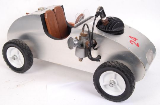 An unusual large American style shelf art / shop display scratch built model motor car. Made from sheet metal, with copper detailing and a small non-functional engine. Detailed large sale model. Measures approx; 65cm long.